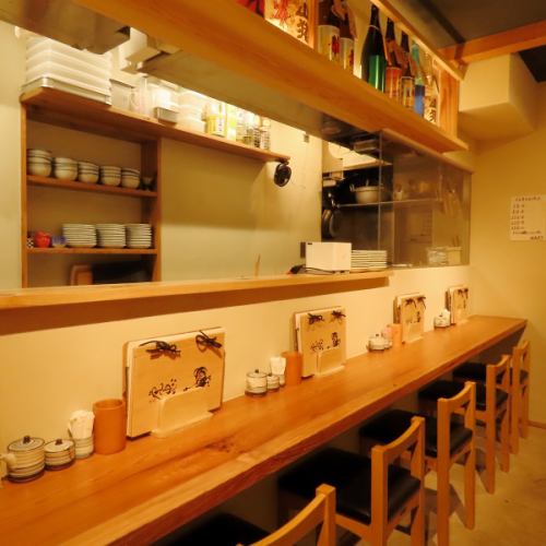 備長炭の香りと職人技を堪能できる、臨場感あふれる1階カウンター席!1階には6席のカウンター席を設けております。目の前には紀州備長炭の焼き台があり、鶏肉が焼ける香ばしい匂いと、店主の丁寧な仕事ぶりを間近で感じられるライブ感が魅力です。焼き立ての味を心ゆくまでお楽しみくださいませ。